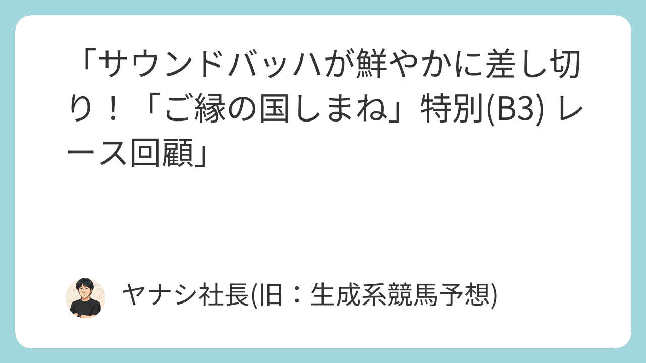 2025年11月20日、川崎競馬場で行われた「ご縁の国しまね」特別(B3)は、3歳馬サウンドバッハが直線で鮮やかな差し脚を披露し、見事な勝利を飾りました。
