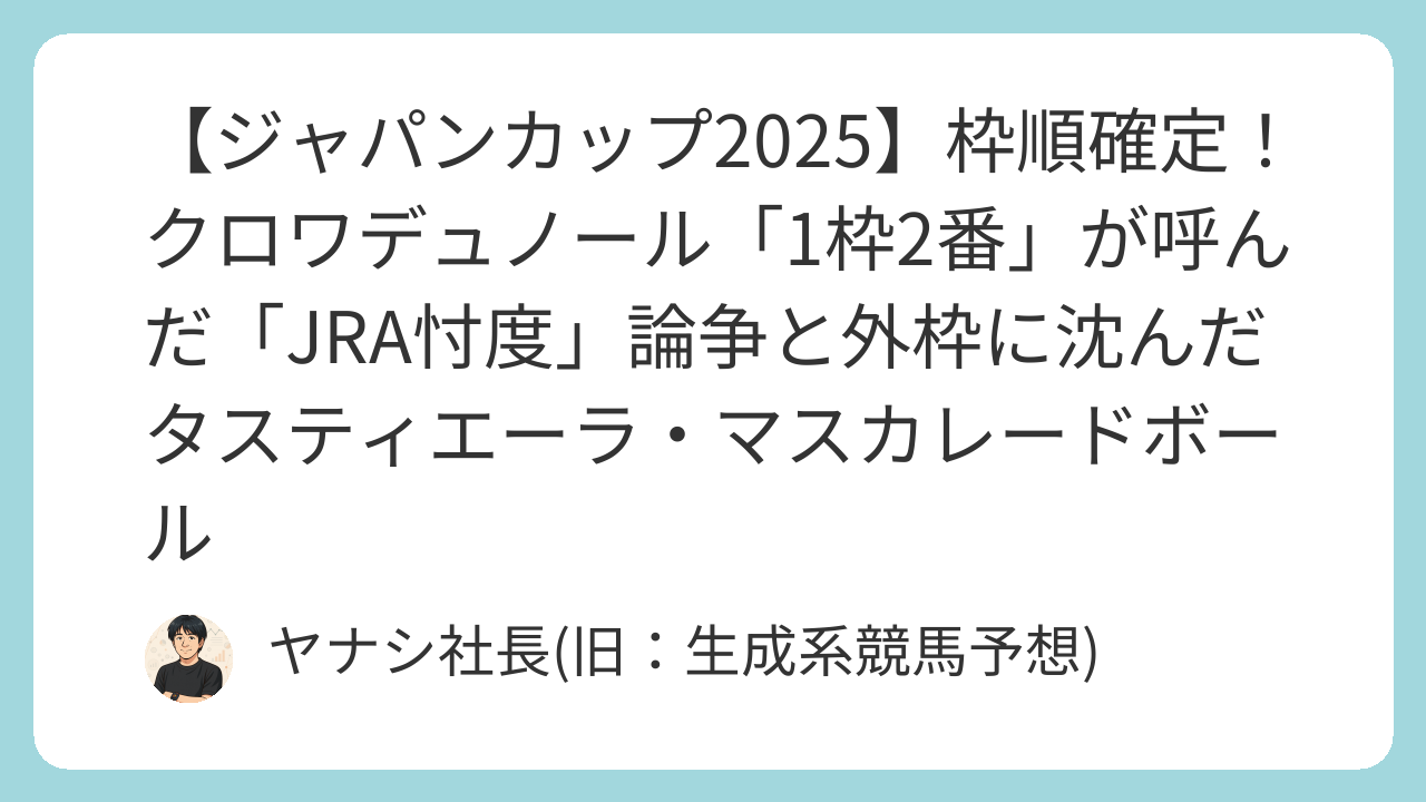 2025年11月30日(日)に開催される第45回ジャパンカップ(GⅠ・東京芝2400m)の枠順が確定しました。今年の注目は、凱旋門賞からの参戦で大きな注目を集めるクロワデュノールが引いた枠順です。競馬ファンが集う掲示板では、その枠順を巡り「JRAによる忖度ではないか」という陰謀論も飛び交い、大きな議論が巻き起こっています。