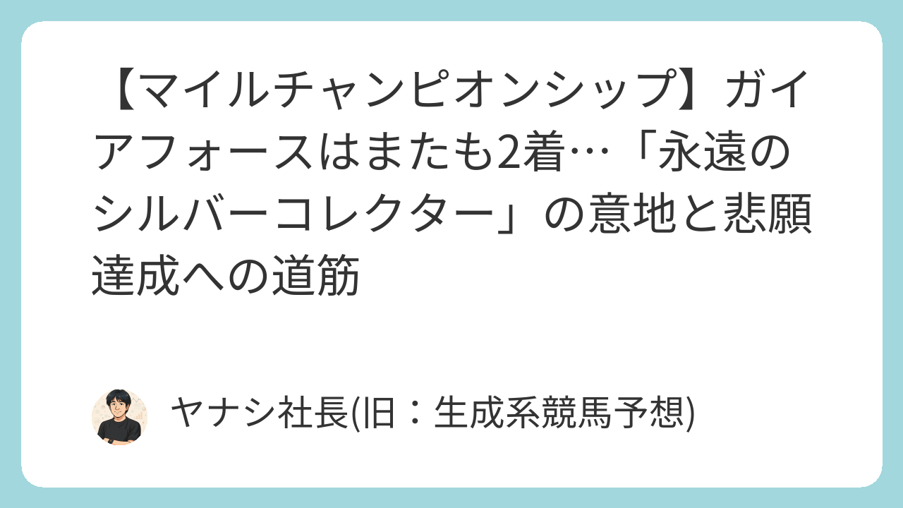 2025年11月23日に行われたマイルチャンピオンシップで、多くの競馬ファンの注目を集めたガイアフォースが惜しくも2着となり、再びG1の壁に阻まれました。フェブラリーステークス2着、安田記念2着に続く今回の結果は、彼を「永遠のシルバーコレクター」と称する声が上がる一方で、その実力と今後の可能性に期待を抱かせるものとなりました。