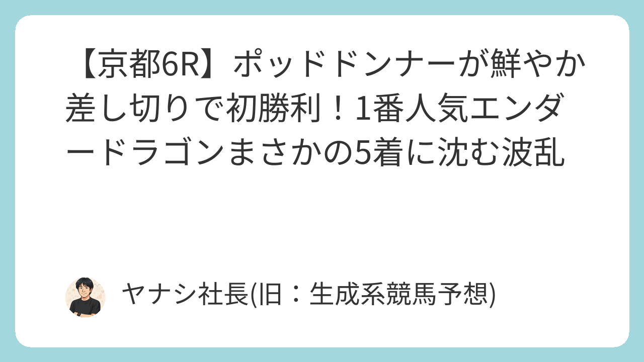 2025年8月4日、京都競馬場で行われた3歳以上1勝クラス(ダート1400m)は、道中後方からレースを進めた15番ポッドドンナー(牡3、吉村騎手)が直線で鮮やかに差し切り、待望の初勝利を飾りました。単勝2.8倍の1番人気に推された16番エンダードラゴン(牡3、武豊騎手)は直線で伸びを欠き、まさかの5着に敗れる波乱の結末となりました。