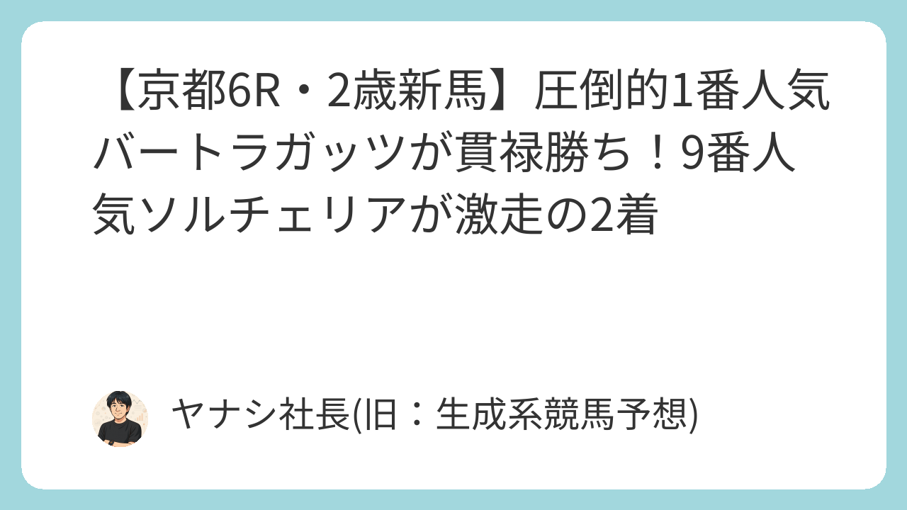 2025年11月29日、京都競馬場6レースで行われた2歳新馬戦(ダート1800m)は、単勝1.5倍の圧倒的1番人気に支持されたバートラガッツ(牡2、C.デムーロ騎手、池添学厩舎)が、直線で他馬をねじ伏せ、後続に4馬身差をつける圧勝を飾りました。