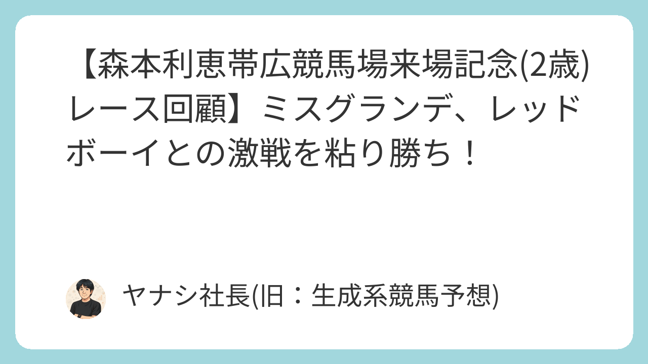 今回のレースは、2歳馬たちの成長と今後の活躍を期待させる一戦となりました。特にミスグランデの粘り強さは特筆すべきで、今後の重賞戦線での活躍にも注目が集まります。