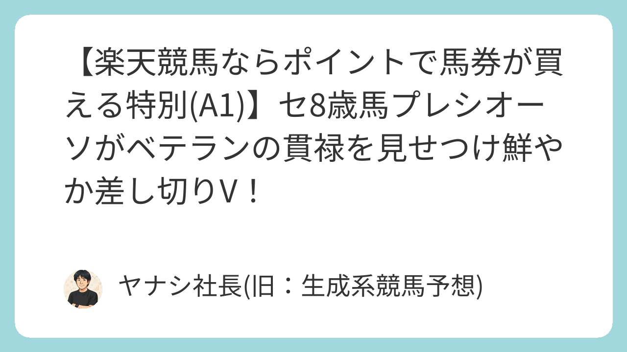 しかし、プレシオーソの勢いは衰えることなく、そのままゴールイン!加藤翔馬騎手との息の合ったコンビで、見事に楽天競馬ならポイントで馬券が買える特別を制しました。2着には追い上げたウェザーコック、3着にはホウオウジュレップが入着し、ベテラン勢の活躍が光る一戦となりました。