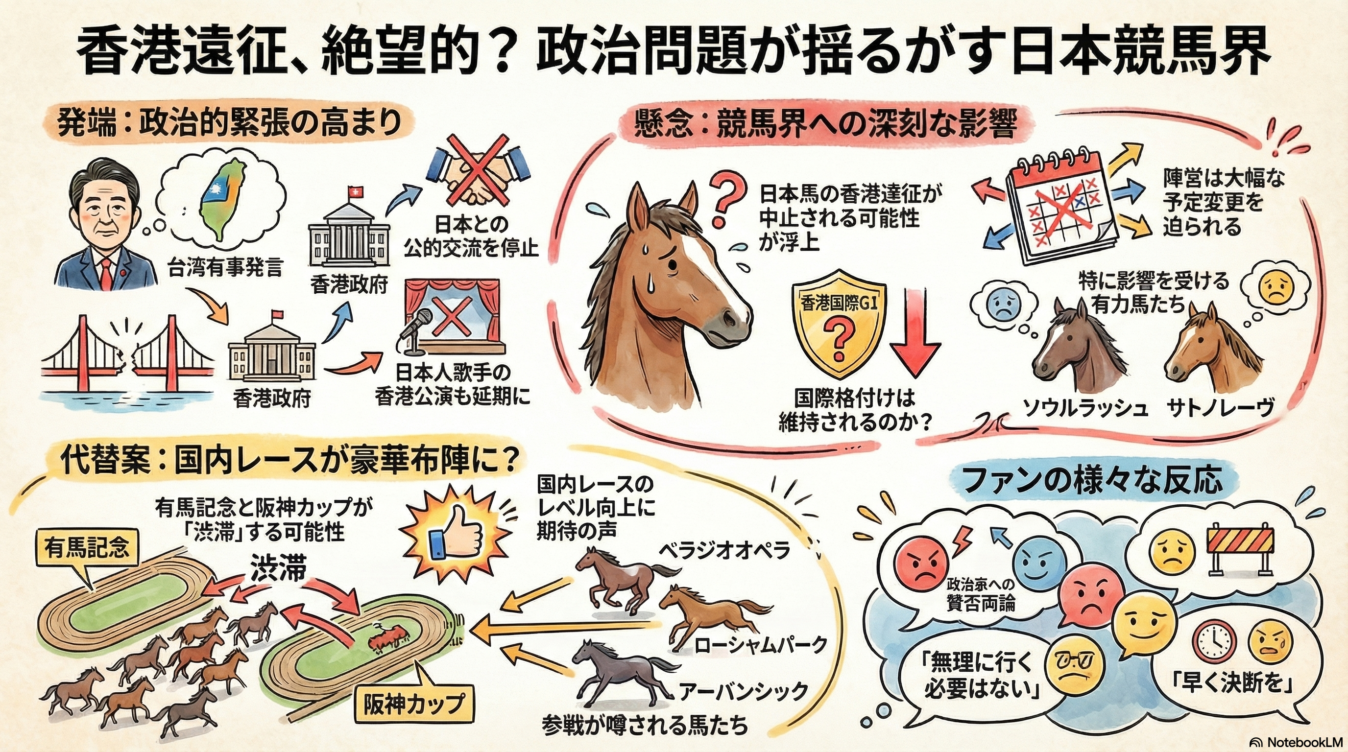 今回の事態は、高市早苗首相の台湾有事を巡る国会答弁への対抗措置を繰り出す中国に香港政府が追従しているものとみられています。日本と香港の間で交流の冷え込みが懸念されており、その影響は競馬界にも及んでいます。