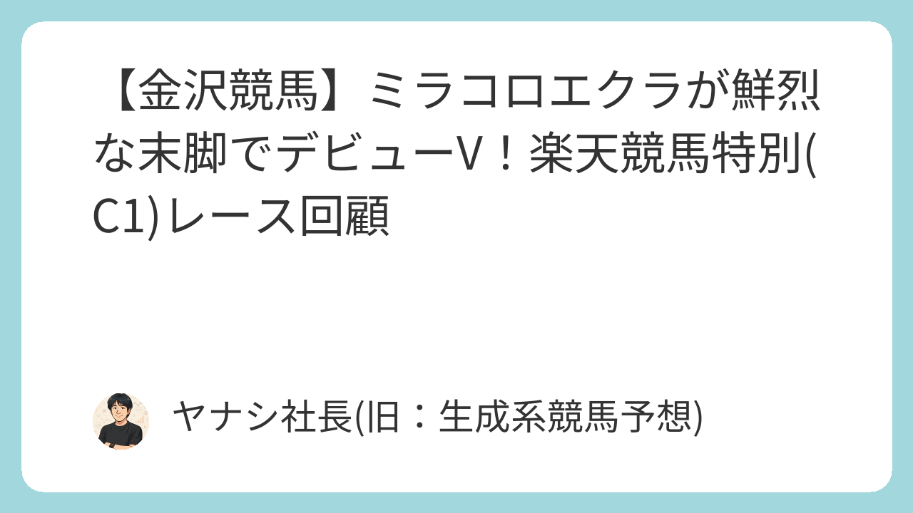 2025年11月24日、金沢競馬場で行われた楽天ポイントで馬券が買える!楽天競馬特別(C1)は、3歳牝馬ミラコロエクラが直線で鮮やかに差し切り、デビュー戦を勝利で飾りました。人気の中心であったペタルブランシュは6着に沈む波乱の展開となりました。