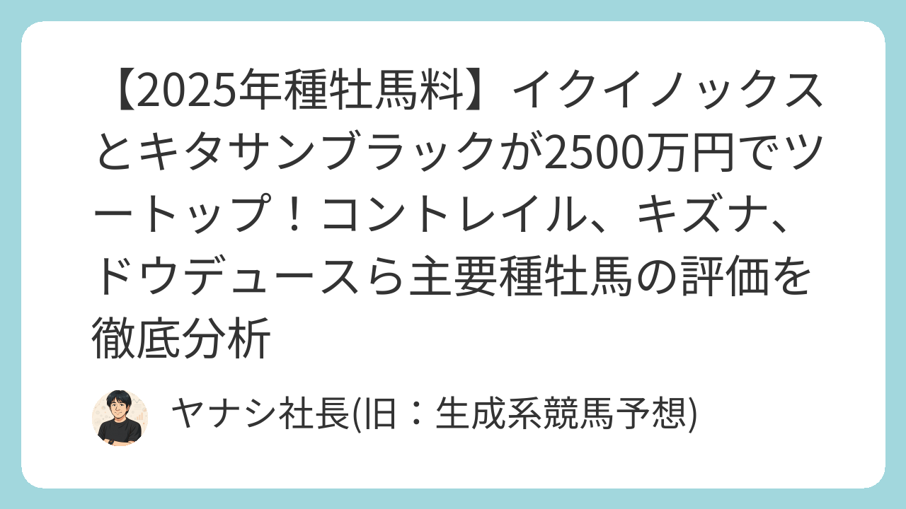 競馬界に衝撃が走っています。2025年の種付け料が発表され、現役時代に数々の輝かしい記録を打ち立てたキタサンブラックと、新種牡馬として大きな期待が寄せられるイクイノックスが、ともに2500万円という破格の金額に設定されました。このニュースは、生産者、馬主、そして競馬ファンに大きな波紋を広げています。