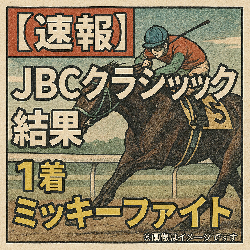 2025年11月3日、船橋競馬場で開催されたダート競馬の祭典「第25回 JBCクラシック(G1)」。1番人気のミッキーファイト(C.ルメール騎手)が4コーナーで先頭に立つと、そのまま後続を突き放し圧勝。帝王賞に続くG1連勝を飾りました。2着には古豪メイショウハリオ、3着には地方馬サントノーレが入りました。