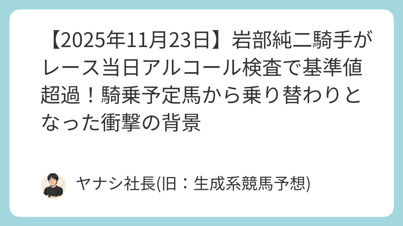 2025年11月23日、岩部純二騎手がレース当日のアルコール検査で基準値を超過。これにより、予定されていた騎乗馬から乗り替わりとなりました。このニュースはYahoo!ニュースでも報じられ、多くの競馬ファンが驚きを隠せませんでした。