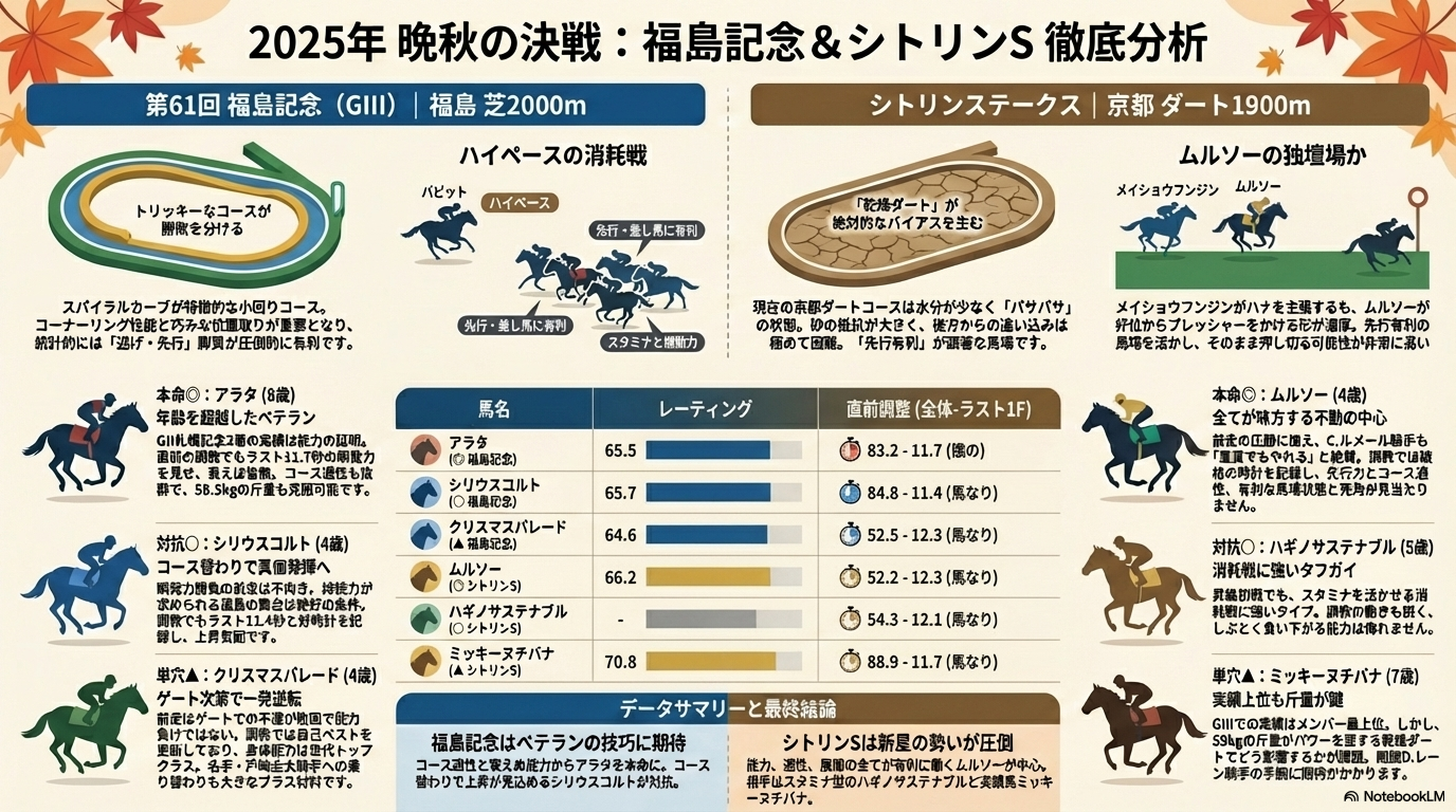 2025年11月開催の福島記念(GIII)とシトリンステークスを徹底分析。本記事では、8歳でも衰えを見せないアラタと、ダート界の新星ムルソーを中心に、調教データやコース適性、血統背景から有力馬を多角的に評価。ハンデ戦の展開やトラックバイアスを考慮し、論理的根拠に基づいた週末の競馬予想と注目馬を解説します。