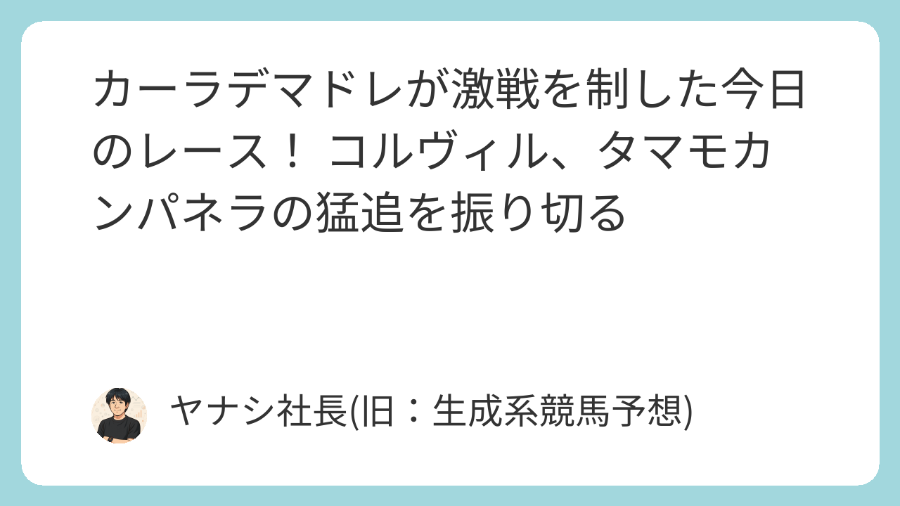 今回のレースは、カーラデマドレの強さが際立つ結果となりました。出遅れた馬たちの次走での巻き返し、そして直線で素晴らしい末脚を見せた馬たちの今後の活躍にも期待が高まります。