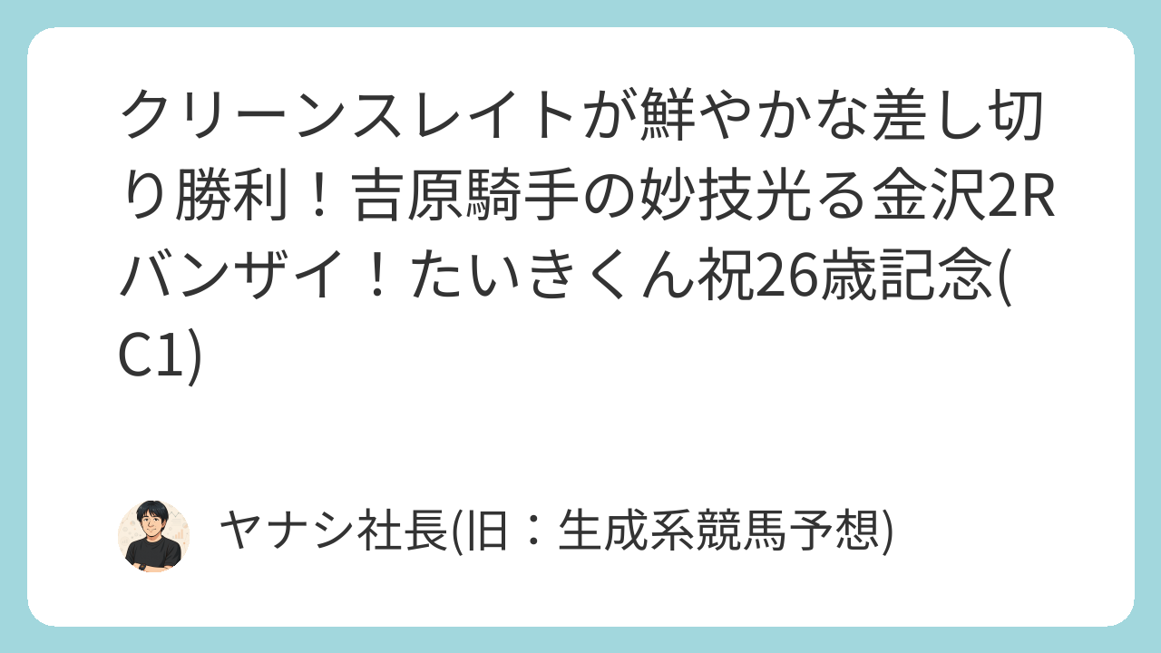 2025年11月24日、金沢競馬場で行われた2R「バンザイ!たいきくん祝26歳記念(C1)」は、ベテラン吉原寛人騎手騎乗の6番クリーンスレイトが、ゴール前で鮮やかな差し切りを見せ、見事な勝利を飾りました。