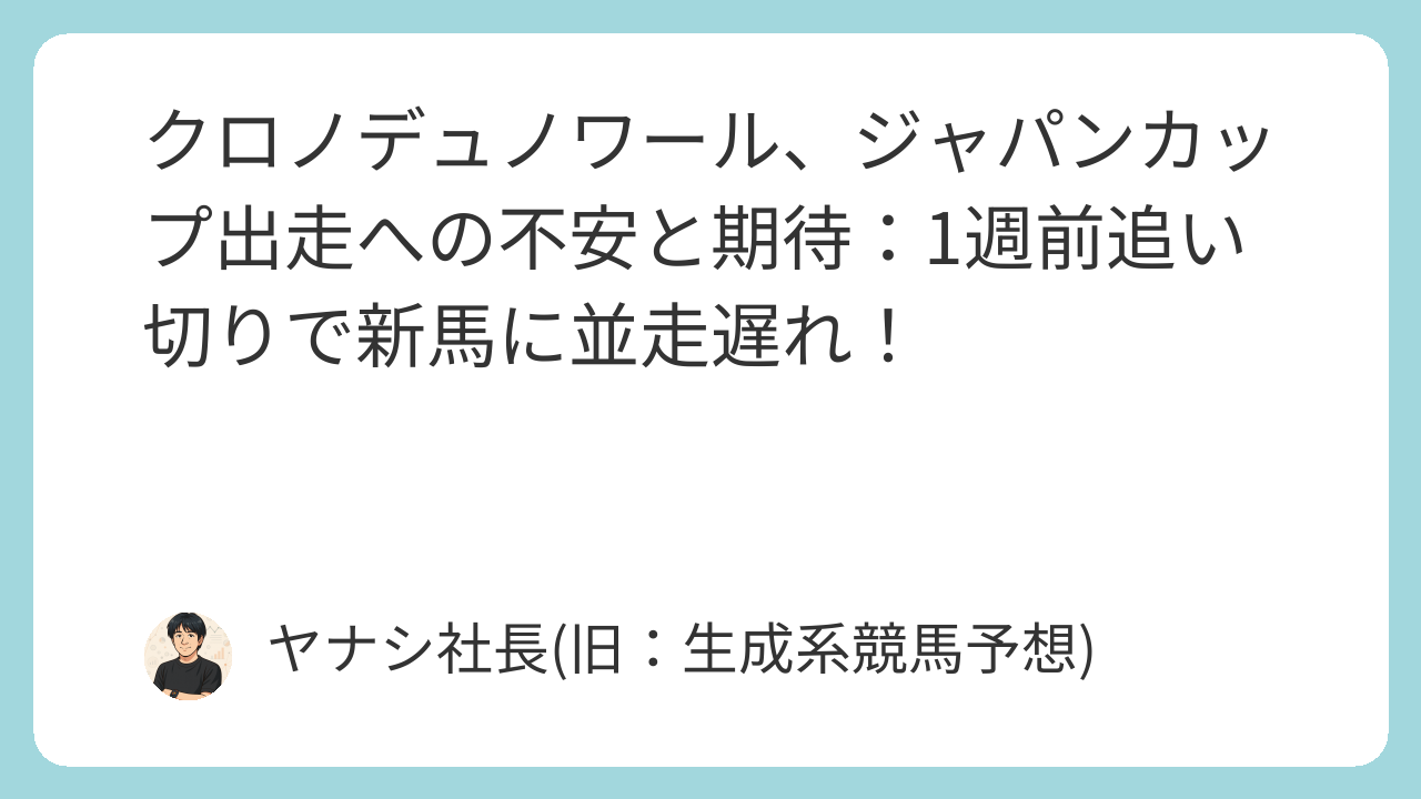 2025年11月19日、競馬ファンの間で大きな話題となっているのが、競走馬クロノデュノワールの1週前追い切りです。ウッドコースでの併せ馬で新馬に並走遅れという結果に、SNSや掲示板では様々な声が飛び交っています。