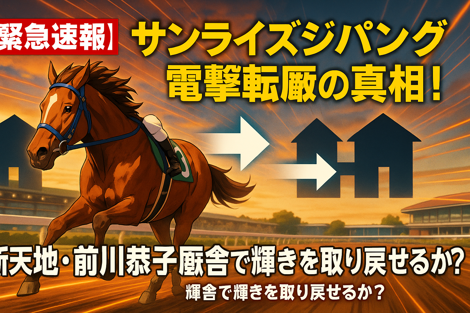 新谷厩舎へ移籍後、フェブラリーステークス(GI)で2着に入るなど活躍を見せましたが、2025年11月に入り、再びの転厩が明らかになりました。今回の転厩先は、2025年3月に開業したばかりの前川恭子厩舎です。なお、サンライズジパングが音無厩舎時代に担当だった平井裕介調教助手が前川厩舎に在籍しており、馬にとっては心強い要素と見られています。