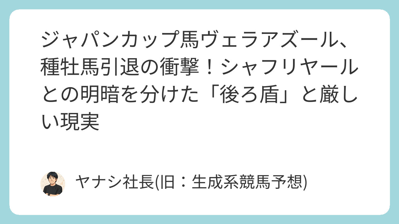 今回の用途変更が事実であれば、ヴェラアズールは競走馬としての役割を終え、新たな道を歩むことになります。彼のジャパンカップでの輝きは色褪せることはありませんが、種牡馬としての道のりは、改めて競馬界の厳しさを浮き彫りにしました。
