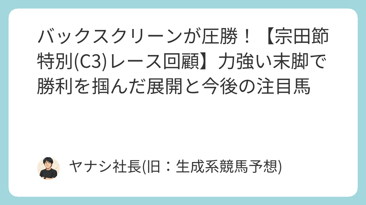 しかし、バックスクリーンの勢いは止まりません。ゴール前でさらにリードを広げ、3馬身、4馬身と差をつけ、群を抜く末脚で回収(勝利)を飾りました。2番手にはカルリーノ、3番手にはクリノバーグマンが入り、アルマリカシバ、リケアブラックが続きました。