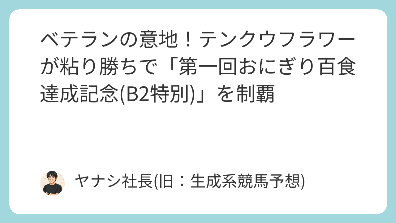 今回の「第一回おにぎり百食達成記念(B2特別)」は、各馬の力と戦略がぶつかり合う見応えのあるレースとなりました。特に上位陣の今後の活躍に期待が高まります。