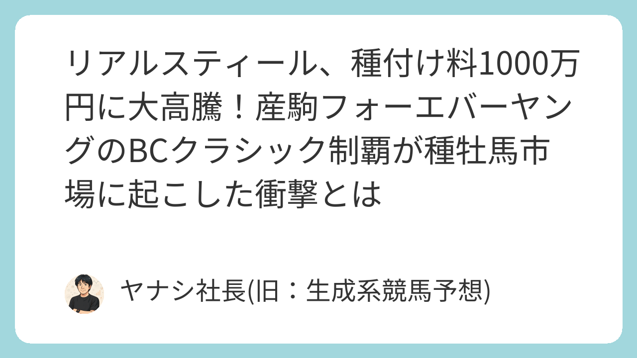 ディープインパクト産駒の種牡馬リアルスティールが、来季の種付け料を1000万円に設定したことが大きな話題となっています。これは、初年度200万円からわずか数年で5倍に跳ね上がったことになり、その背景には産駒フォーエバーヤングの活躍が強く影響していると見られています。BCクラシック制覇という偉業を達成した産駒の存在が、種牡馬の価値をどのように変えたのか、競馬ファンの間で交わされた議論を元に、その高騰の理由と今後の展望を深掘りします。