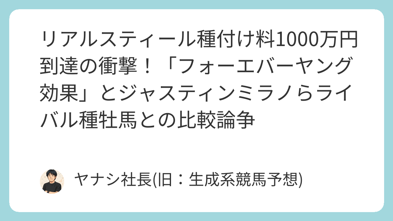 - 種付け頭数への影響:価格が高騰したことで、「1000万じゃ頭数集まらないだろ流石に」(ID:DhBTWKb20)という懸念も出ましたが、「種牡馬の負担を増やさないように 集めないための値上げ」(ID:ElPqwBgN0)という深読みをする意見も見られました。