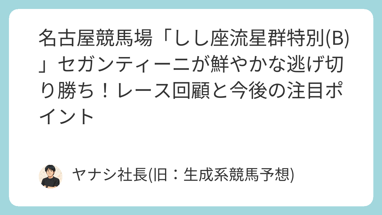 「しし座流星群特別(B)」は、セガンティーニの強さが際立つ一戦となりました。今後の名古屋競馬、そして各馬の活躍に引き続きご注目ください。