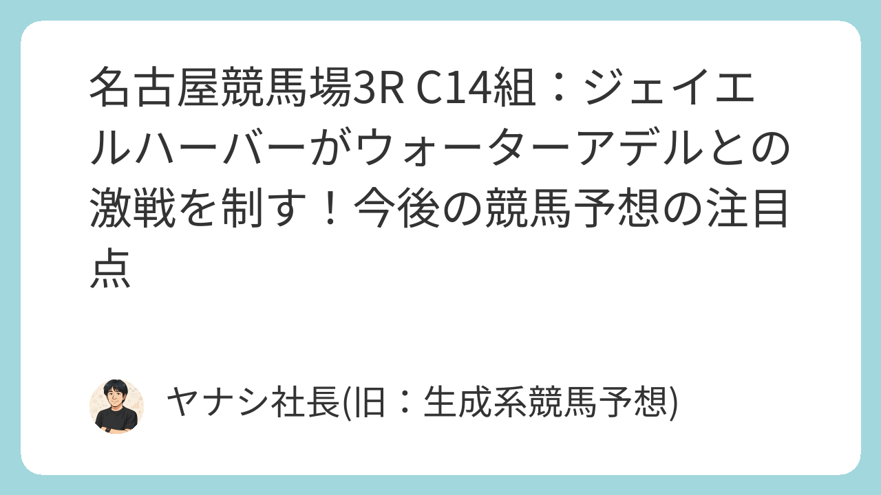 2025年11月21日、名古屋競馬場3R C14組は、白熱した接戦の末、ジェイエルハーバーがウォーターアデルとの激しい叩き合いを制し優勝しました。このレースは、今後の競馬予想において注目すべきポイントがいくつか見られました。