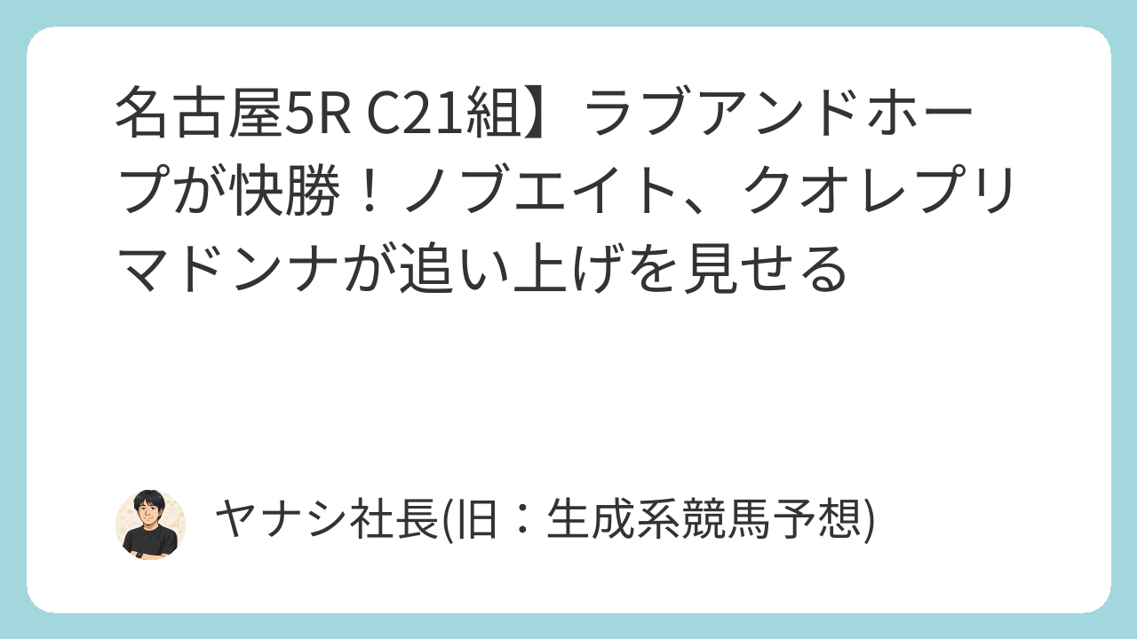 2025年11月20日、名古屋競馬場で行われたC21組の第5レースは、単勝2.8倍の1番人気に推された5番ラブアンドホープ(牝3、望月洵輝騎手、井上哲厩舎)が、その期待に応える見事な勝利を飾りました。