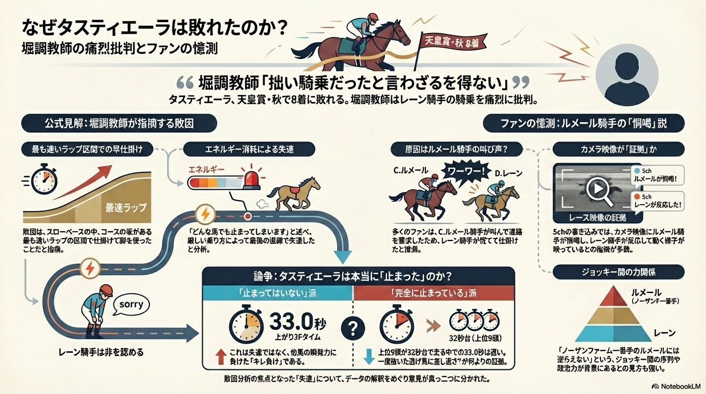 2025年11月21日に投稿された5ちゃんねるのスレッドで、美浦・堀宣行厩舎所属の堀調教師が、天皇賞・秋(2025年)でタスティエーラ(牡5歳、父サトノクラウン)に騎乗したダミアン・レーン騎手の騎乗を「拙い騎乗だった」と痛烈に批判し、競馬ファンの間で大きな波紋を呼んでいます。