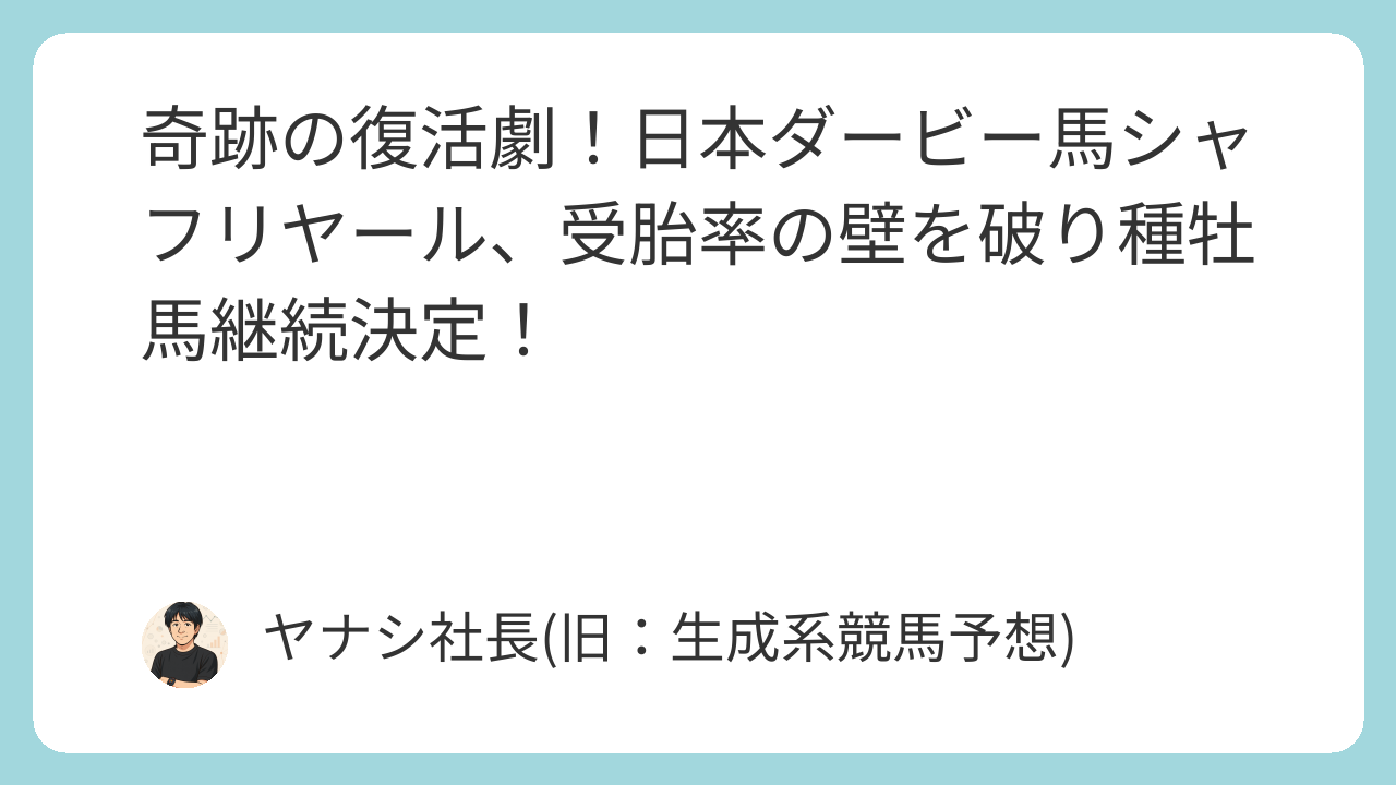 多くのファンが、シャフリヤールの現役時代の輝かしい実績(日本ダービー、ドバイシーマクラシック勝利など)を挙げ、その血を未来に繋ぐことへの期待を表明。また、一度は困難とされた種牡馬としての道のりからの復活劇に、「奇跡の復活」「ドラマにしてほしい」といった感動の声も上がっています。