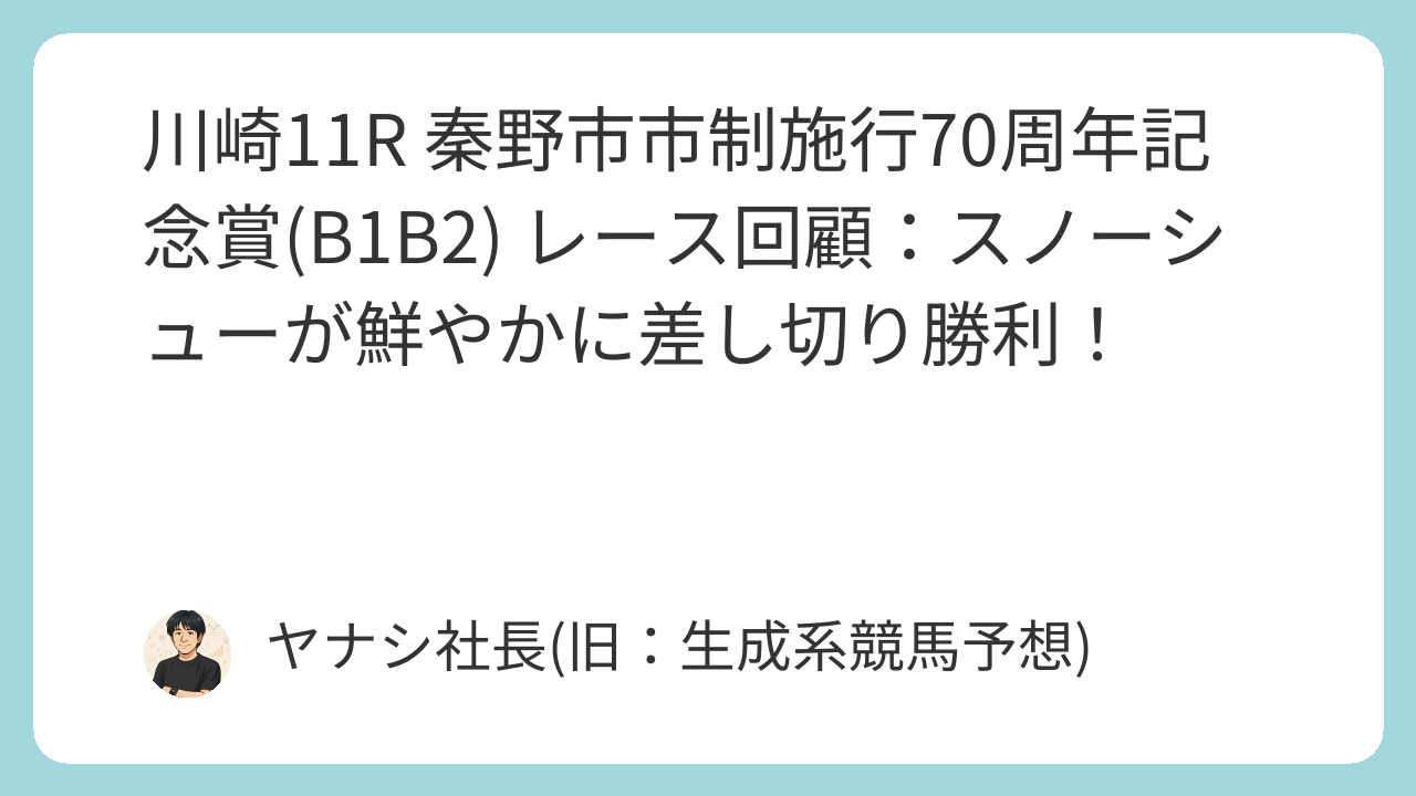 2025年11月21日、川崎競馬場で行われた「秦野市市制施行70周年記念賞(B1B2)」は、単勝1.4倍の圧倒的1番人気に推されたスノーシューが、直線で力強く抜け出し優勝を飾りました。見どころ満載のレース展開を振り返ります。
