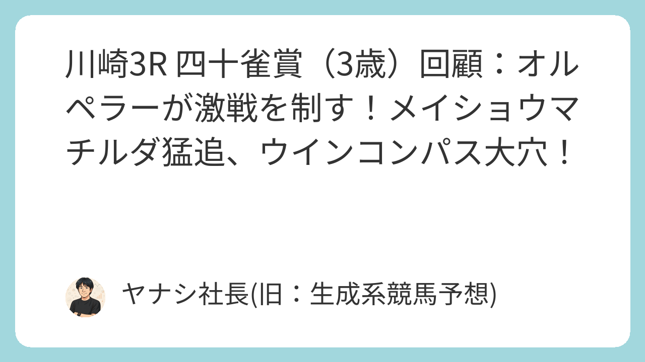 2025年11月19日、川崎競馬場で行われた3歳馬による「四十雀賞」は、単勝1.4倍の圧倒的1番人気に推されたオルペラーが、ゴール前での激しい叩き合いを制し、見事勝利を飾りました。レースは序盤から波乱含み、見どころ満載の展開となりました。