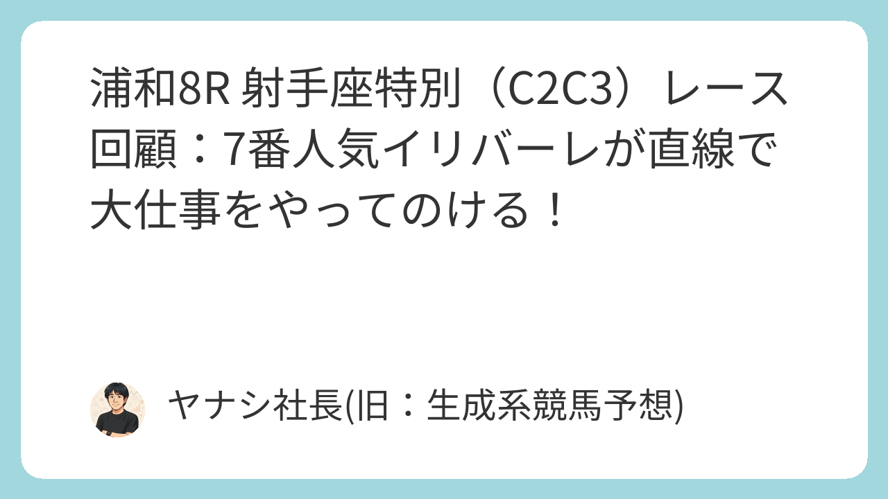 2025年11月27日、浦和競馬場で行われた第8レース「射手座特別(C2C3)」は、波乱の結末となりました。レースは最後まで激しい追い比べとなり、7番人気の伏兵イリバーレ(牡3、赤津和希騎手)が、ゴール前で先行勢を豪快に差し切り優勝。混戦のメンバー構成を覆す見事な勝利を飾りました。