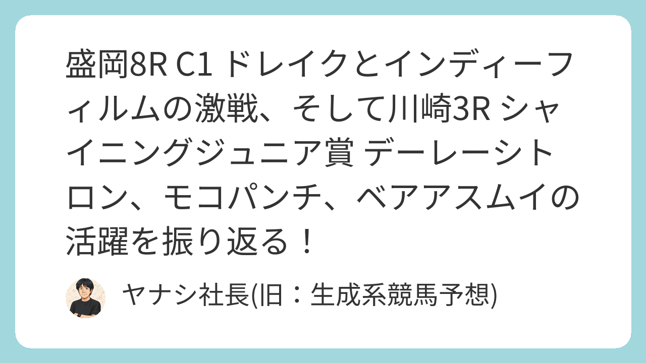 盛岡8R C1 ドレイクとインディーフィルムの激戦、そして川崎3R シャイニングジュニア賞 デーレーシトロン、モコパンチ、ベアアスムイの活躍を振り返る!