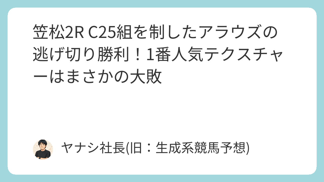 2025年11月27日に行われた笠松2R C25組(ダート1400m)は、単勝1.7倍の圧倒的1番人気に推されたテクスチャーがまさかの惨敗を喫し、4番人気のアラウズが鮮やかな逃げ切り勝ちを収める波乱の決着となりました。若き井口裕貴騎手の手綱捌きが光った一戦を振り返ります。