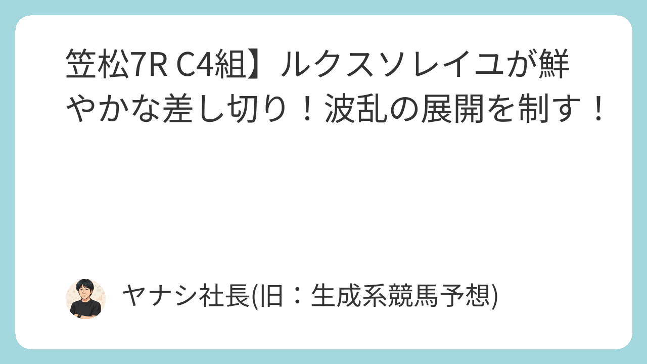2025年11月19日に行われた笠松7R C4組は、2番人気のルクスソレイユが直線で力強く伸びて勝利を飾りました。レースは序盤から激しい先行争いが繰り広げられ、見どころの多い一戦となりました。