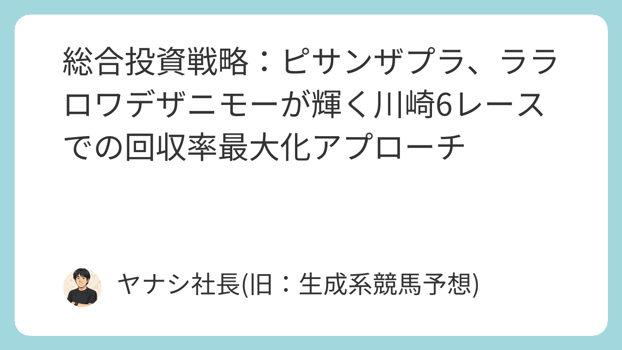 特に川崎6レースの4番ララロワデザニモーは、血統、調教、コース適性、そして陣営の自信、すべてが高次元で融合していると断言できます。想定勝率47%は本日の全レース中でも最高水準であり、単勝・連単の軸として不動の存在です。ここは安心して投資できる「銀行レース」として、馬券の主軸に据え、他のレースへの資金を投じるための基盤とすることがおすすめです。