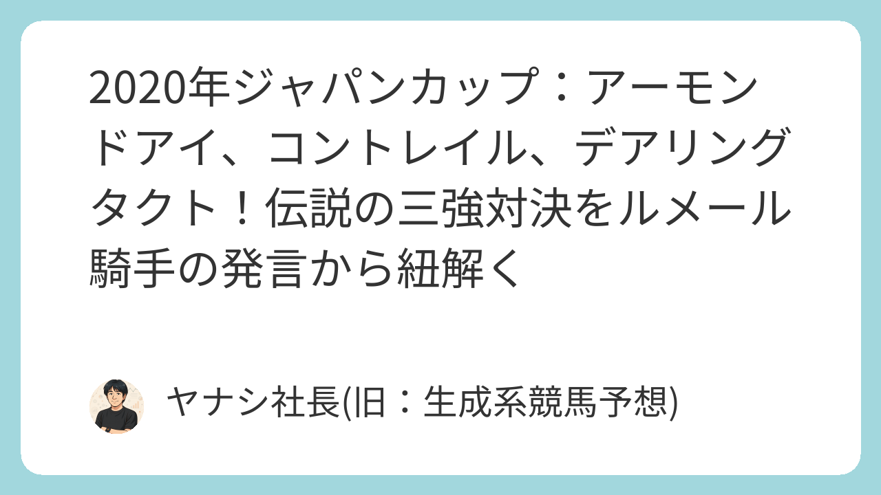 クリストフ・ルメール騎手が「2020年のジャパンカップは間違いなく過去最高レベルのG1」と評した一戦。無敗の三冠馬コントレイル、無敗の三冠牝馬デアリングタクト、そして引退レースとなる女王アーモンドアイという、競馬史に残る豪華メンバーが集結したこのレースは、多くのファンの記憶に深く刻まれています。今回は、この世紀の一戦の背景、出走馬たちの見どころ、そしてレース後のファンの声まで、その魅力を余すところなくお伝えします。