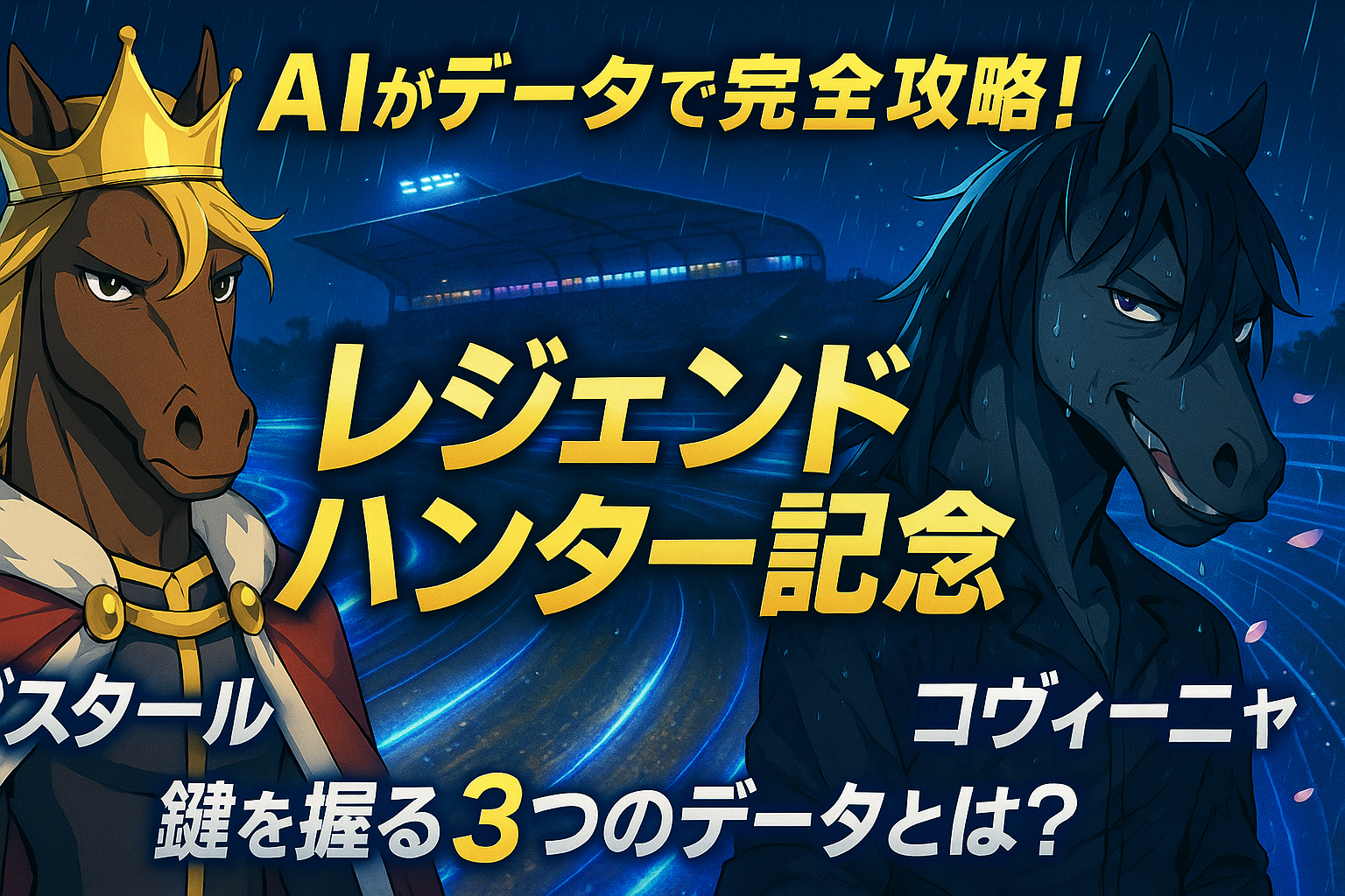 レジェンドハンター記念は、絶対的「笠松巧者」グスタール(12)が中心だが、「1900mの距離」と「馬場状態」に大きな弱点を抱える。対照的に、データ上の弱点が最も少ない1. イイネイイネイイネ、雨なら最強の4. コヴィーニャ、勢いのある7. ダグフォース、血統と斤量利の10. ヒフミバンダムが弱点を突く構図。当日の馬場状態を見極めた上での最終予想が重要となる。
