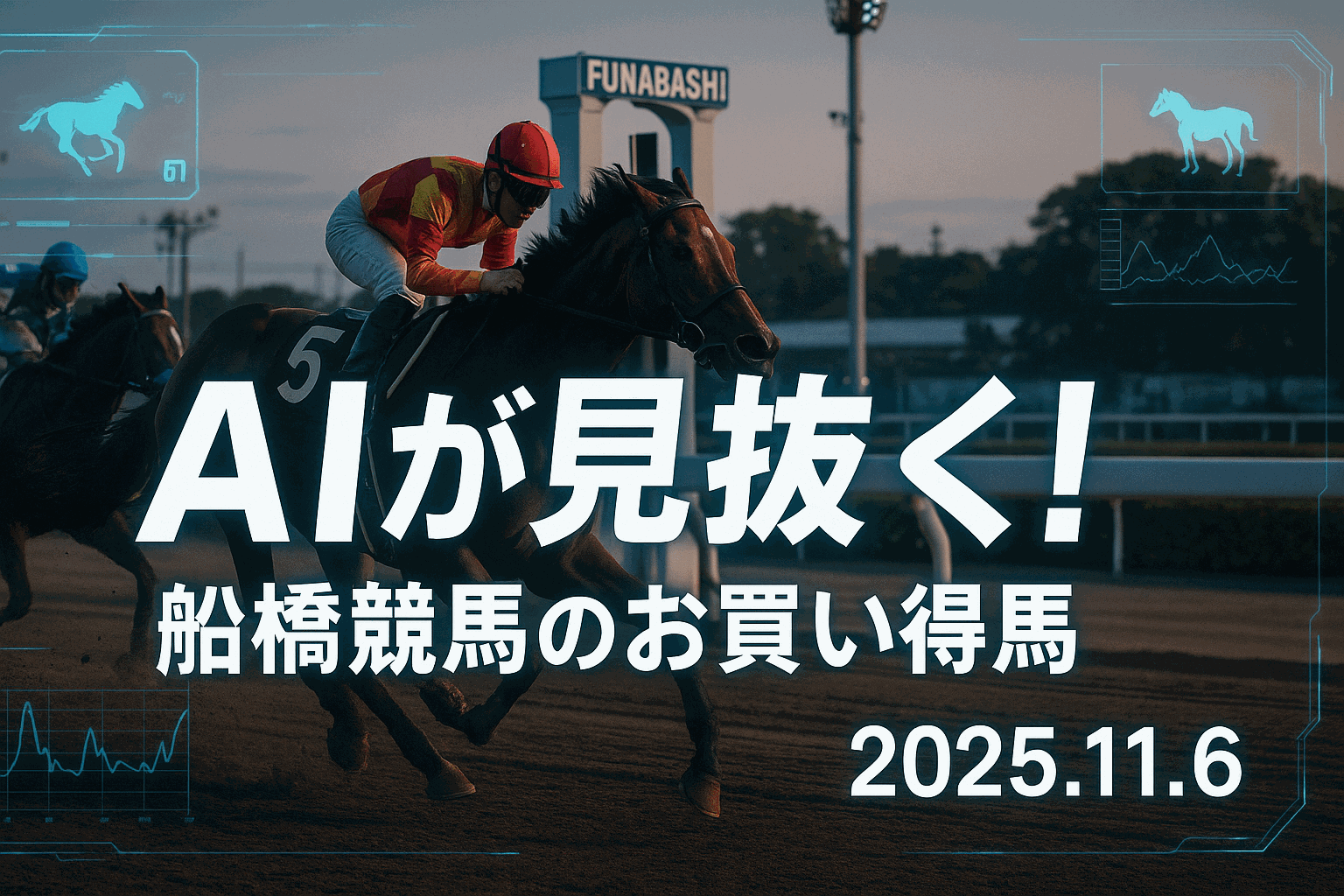 We deliver horse racing predictions for “Value Bets” at the Minami Kanto Funabashi Racecourse on November 6, 2025, combining AI’s quantitative predictions with expert qualitative information. Focusing on the gap between AI-calculated win probabilities and market odds, we thoroughly analyze horses from strong favorites to promising longshots. We provide commentary on key horses in each race, including Primo Python in the main race “Kamuyukara Sprint,” along with stable comments and training data.