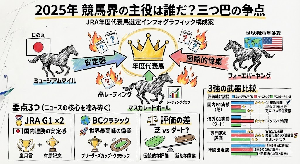 2025年のJRA年度代表馬選定を巡り、ネット上の議論が白熱しています。特にファンやメディアの間では、「ミュージアムマイル」「フォーエバーヤング(エバヤン)」「マスカレードボール」の3頭が有力候補として挙げられ、それぞれの実績を比較する声が多く見られます。本記事では、ユーザー投稿内容を基に、各馬の評価ポイントと、選定の鍵となる要素を分析します。