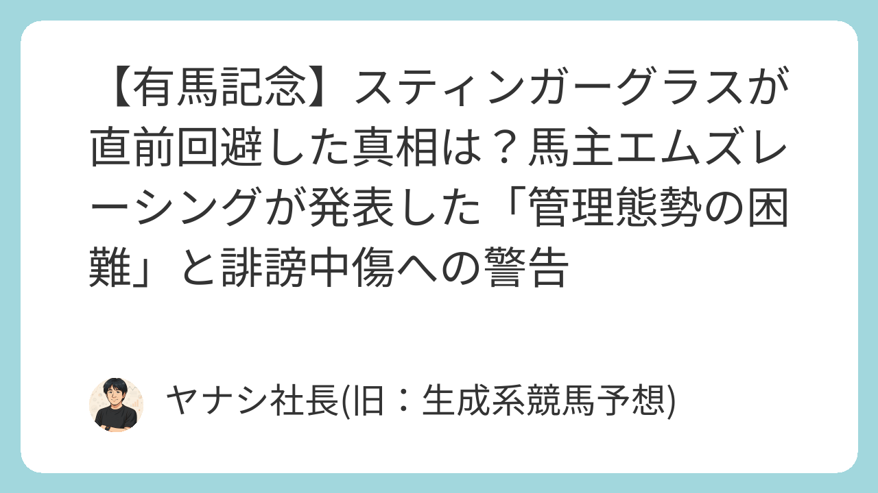 スティンガーグラスの有馬記念回避は、馬主であるエムズレーシングが2025年12月17日に公式Xアカウントで公表しました。