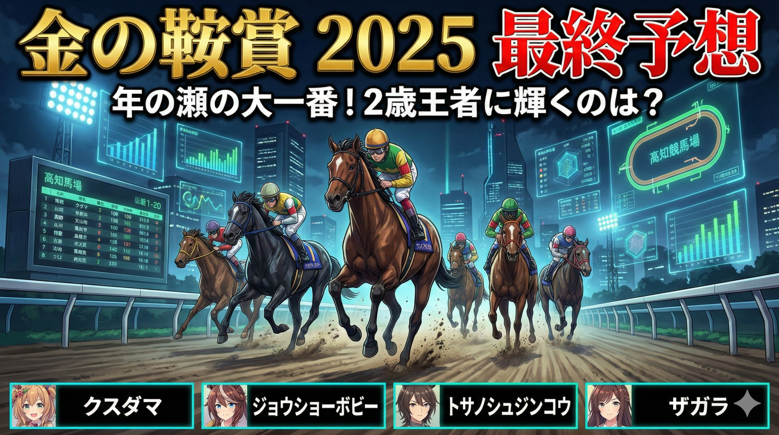 2025年12月28日、高知競馬場で2歳世代の頂点を決める一戦「第47回 金の鞍賞」が開催されます。将来性豊かな若駒が揃う中、本記事では過去のレース傾向や血統背景を基に、主役候補のクスダマや勢いに乗るジョウショーボビーなど、有力馬の取捨選択と予想のポイントを徹底解説します。