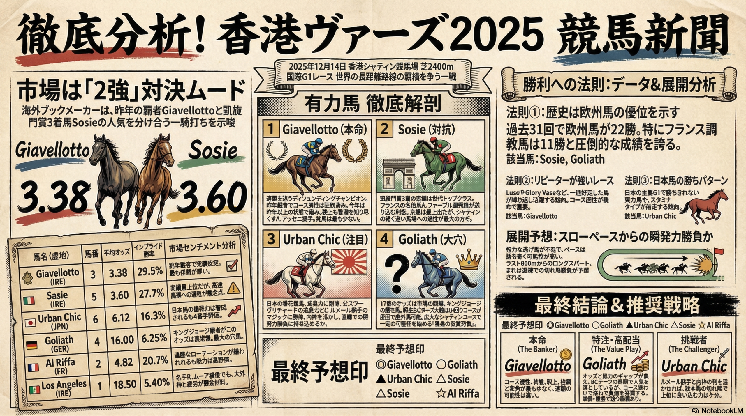 Scheduled for December 14, 2025, the Group 1 Hong Kong Vase is a pinnacle showdown gathering the world’s finest stayers. This comprehensive analysis meticulously dissects the anticipated odds from leading overseas bookmakers. We focus on the ‘Big Three’ contenders: Giavellotto, aiming for back-to-back victories; Sosie, a formidable Arc de Triomphe third-place finisher; and Japan’s St Leger champion, Urban Chic. Beyond these favorites, we conduct a thorough breakdown of dark horses like King George winner Goliath. By deciphering the ‘collective wisdom’ embedded in the odds, we present precise betting strategies for this unmissable event.