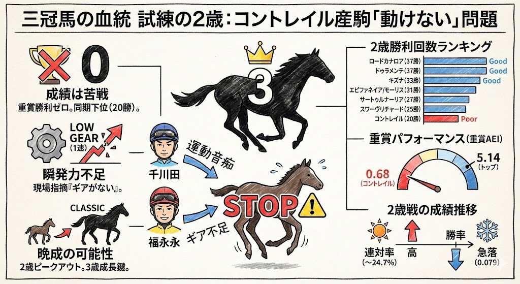 三冠馬コントレイルの初年度産駒が2歳シーズンを終え、その成績を巡る議論が競馬界で過熱しています。特に、現場のトップジョッキーや調教師からの厳しい意見が飛び出し、ファンの間でも様々な分析が展開されています。本記事では、2025年2歳戦終了時点の具体的な成績データと、関係者のコメントを基に、種牡馬コントレイルの現状を深く掘り下げます。