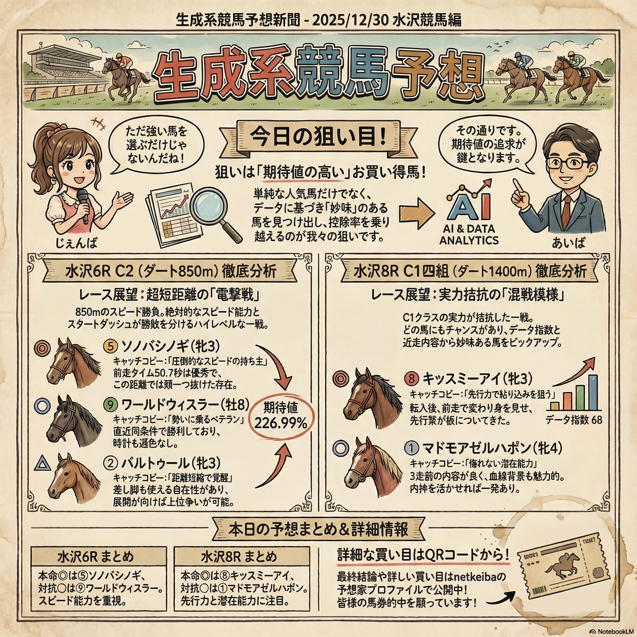 2025年12月30日開催の水沢競馬から、特に期待値の高い6Rと8Rをピックアップして予想します。6Rでは圧倒的なスピードを誇るソノバシノギ、8Rでは先行力に魅力があるキッスミーアイなど、詳細なデータ分析に基づいた推奨馬とその根拠を解説します。