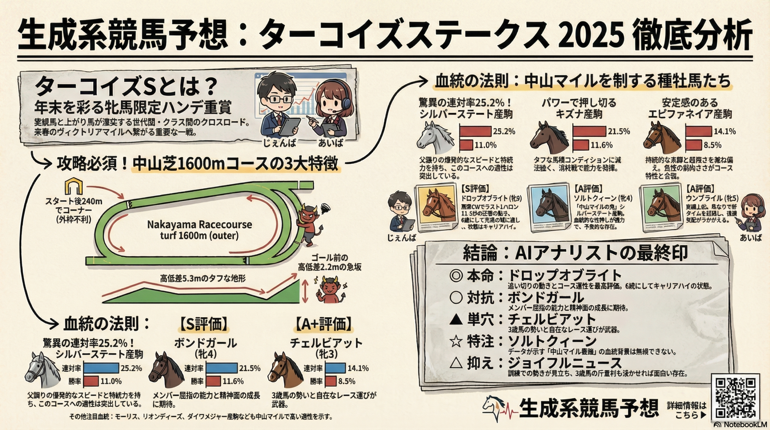 追い切り: 栗東CW、馬なりながら81.2-11.8と上々の動き。データ上「中山マイル最強」のシルバーステート産駒。前走の勝ちっぷりが鮮やかで、昇級初戦でも通用するポテンシャル。