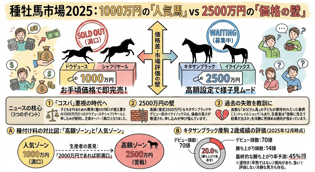 本記事では、インターネット掲示板の投稿内容を元に、最新の種牡馬市場の動向と、高額種牡馬に対する生産地のリアルな評価についてまとめます。