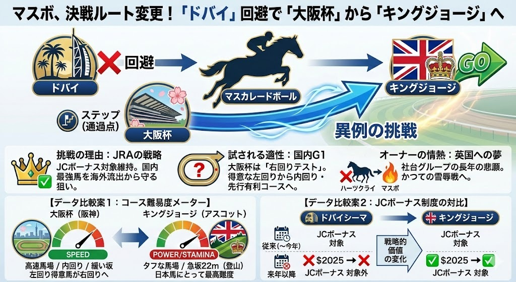 最大の理由は、ドバイシーマクラシックが来年からジャパンカップのボーナス対象から外れる一方で、キングジョージは対象に残るというJRAの制度変更の影響が考えられます。また、右回り適性のテストや、オーナーサイドのキングジョージ挑戦への強い意向も背景にあると推測されています。