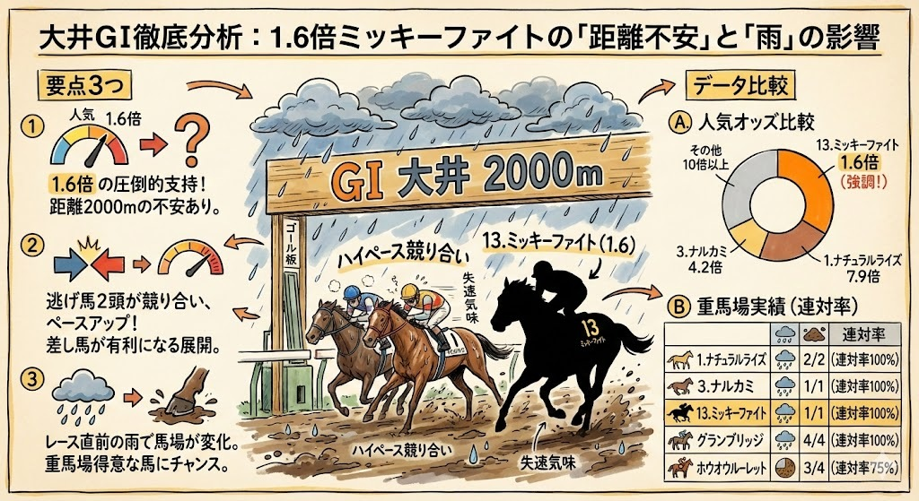 2025年のダート競馬を締めくくる大一番、第71回東京大賞典(GI・大井ダ2000m)について、発走を控えたファンコミュニティでのリアルな議論と予想をまとめました。C.ルメール騎手騎乗のミッキーファイトが単勝1.6倍の圧倒的1番人気を集める中、展開の鍵を握る3歳勢や、レース直前に降った雨による馬場状態の変化など、白熱した議論のポイントを解説します。