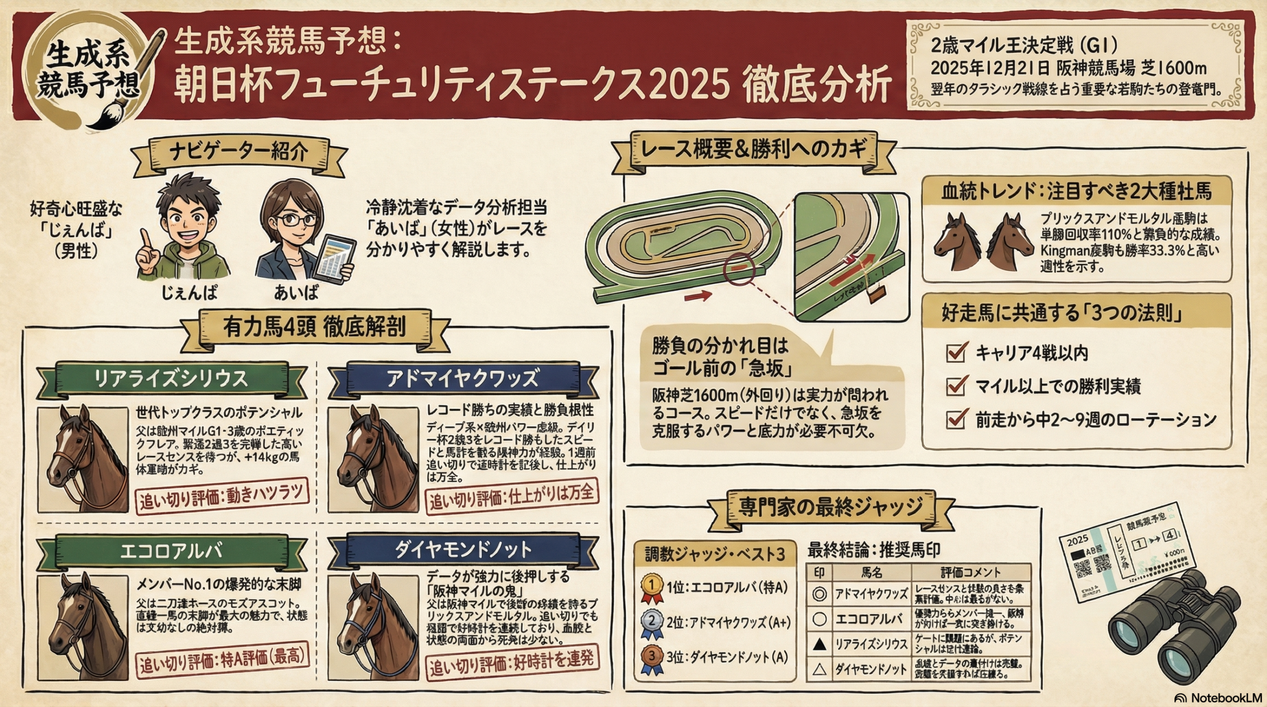 今回の朝日杯FSは、実力拮抗の好メンバーが揃いました。 アドマイヤクワッズを軸に、破壊力抜群のエコロアルバ、 そしてデータと血統が推すダイヤモンドノットを組み合わせた馬券が妙味を呼びそうです。