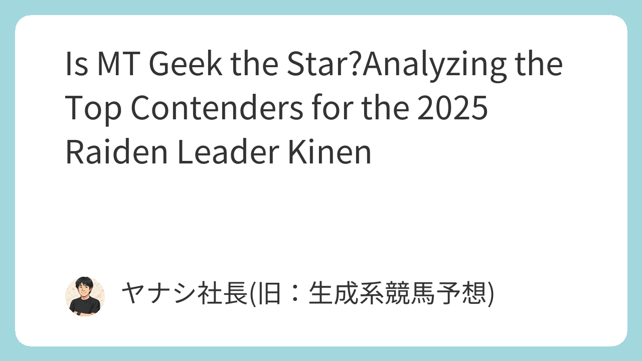 The 2025 Raiden Leader Kinen is shaping up to be MT Geek’s race to lose, given his spectacular recent form. The main question is whether local hero Stay Free and the classy River Street can mount a serious challenge. From a pedigree perspective, it’s a battle between the speed of Danon Premium’s offspring and the proven dirt specialists.