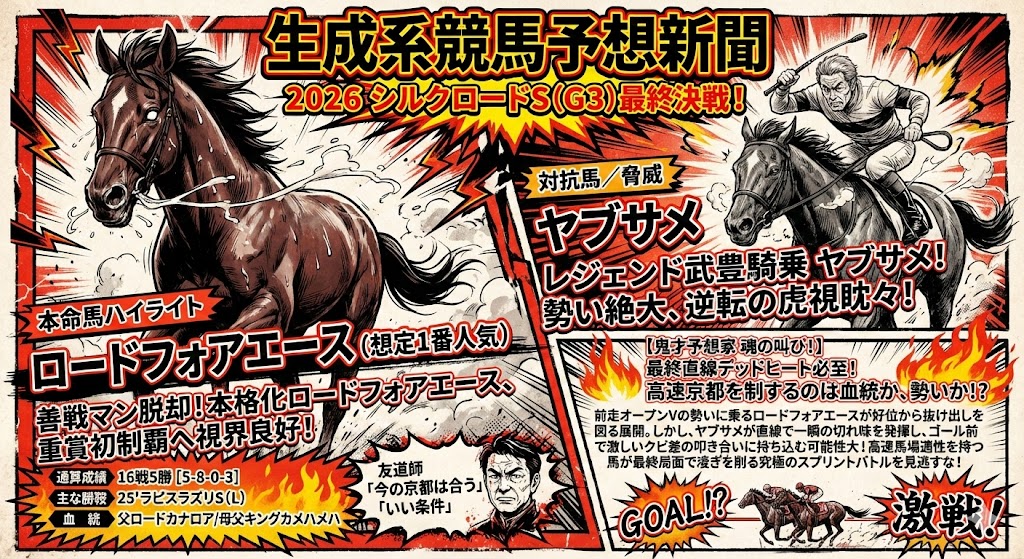- 【シルクロードS展望】混戦模様も前走内容のいいロードフォアエースが主役 武豊×ヤブサメの勢いも怖い (中央競馬) – 2026年01月26日 11時53分 – [netkeiba]